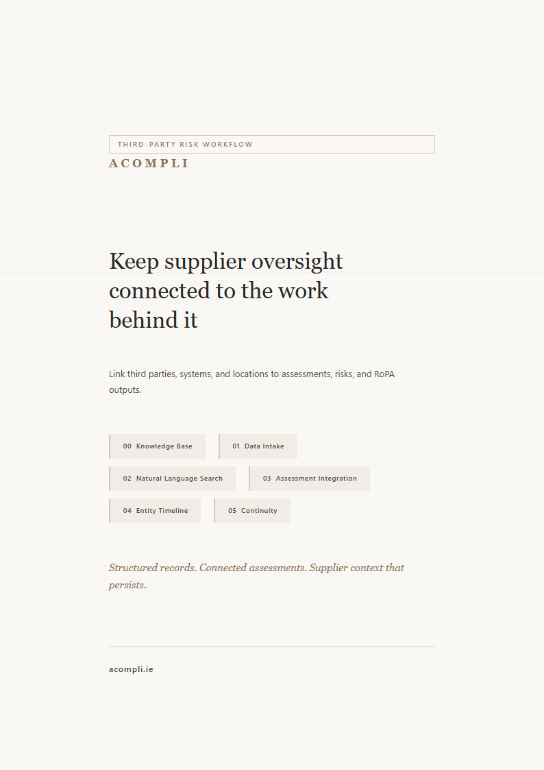 Acompli maintains supplier, processor, system, and location records as part of a connected privacy workflow, with those entities available across assessments, risk, and RoPA. Due diligence activity, supporting records, and downstream outputs remain linked within the same platform.